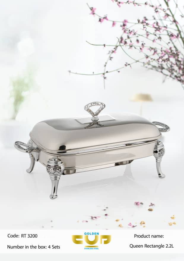 سوفله مستطیل متوسط کوئین با حجم چهار لیتر ساخت کشور چین باعث گرم نگه داشتن غذا می باشد.