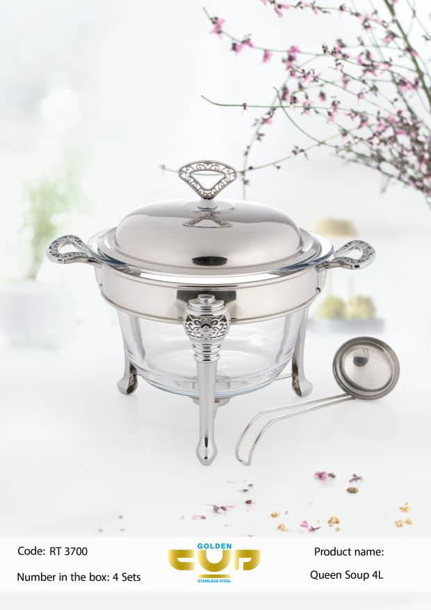 سوپ خوری کوئین با حجم چهار لیتر ساخت کشور چین باعث گرم نگه داشتن غذا می باشد.سوپ خوری کوئین مناسب پذیرایی سوپ خوری,انواع خورشت و …. می باشد.سوپ خوری کوئین دارای پیرکس فرانسه 4 لیتری می باشد.